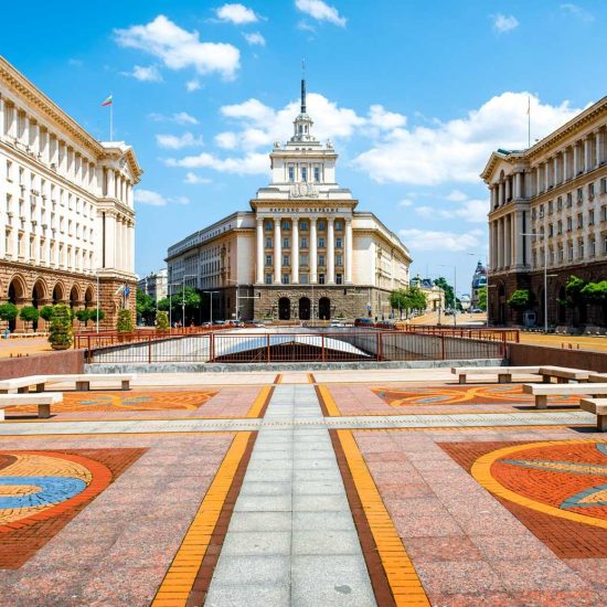 An architectural ensemble of three Socialist Classicism edifices in central Sofia, the capital of Bulgaria